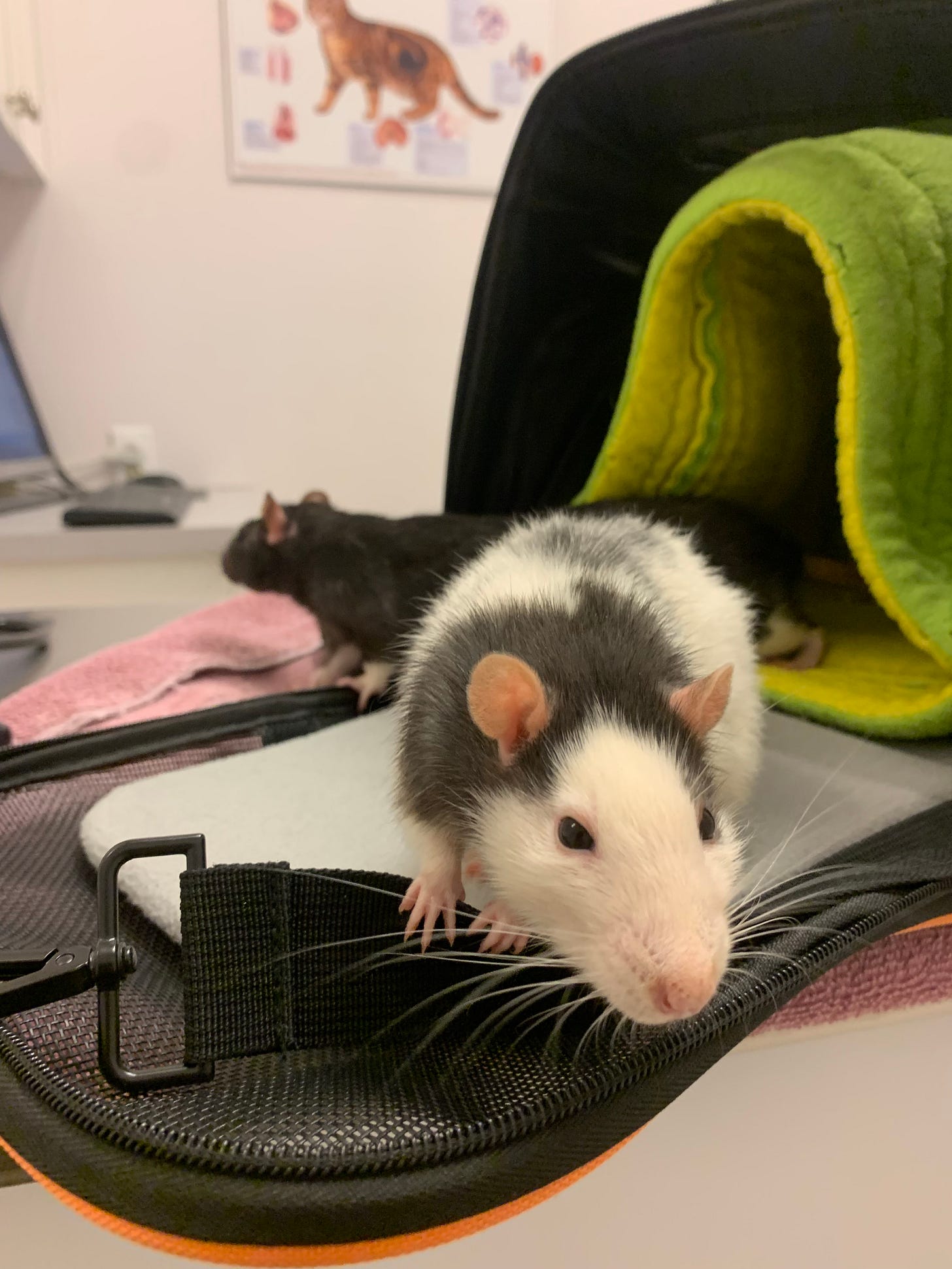 Last weekend, we brought three senior rats into our lives. We adopted them from a couple that was moving and couldn’t bring them to their new home; they were planning on euthanizing them if they couldn’t find new owners before their move. We kept two of their names (Winston and Zeus) but had to change poor Nightmare’s, because who wants to be called Nightmare? His new name is Edgar (Allen Poe), a nod to our other rat, Rumi. Nick brought them to the vet on Wednesday and we are currently treating Edgar’s respiratory infection. All three are in good health otherwise and seem to have adjusted well to their new home.
