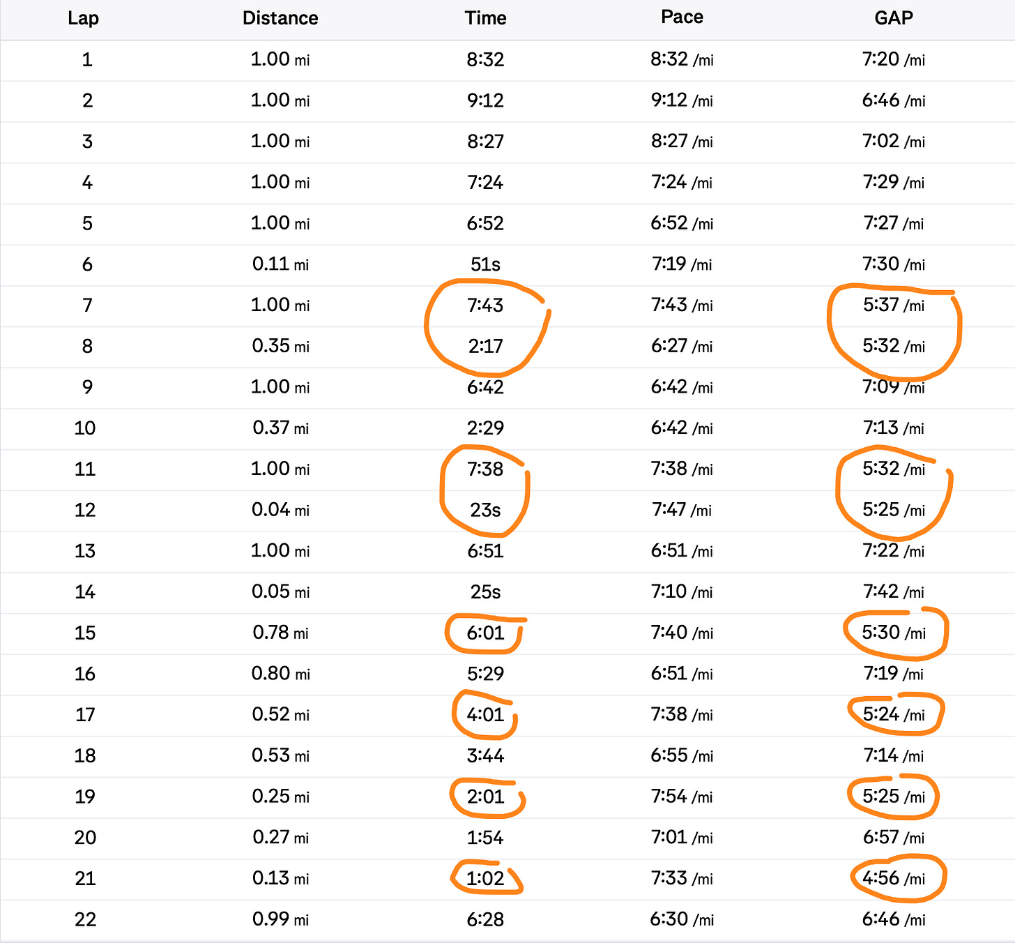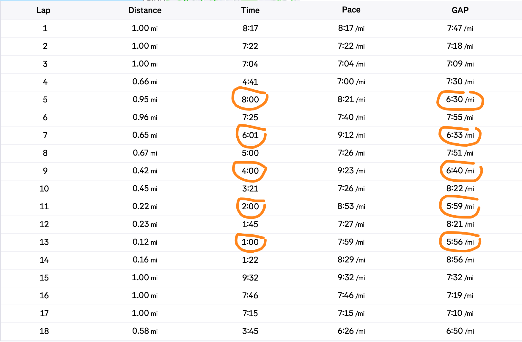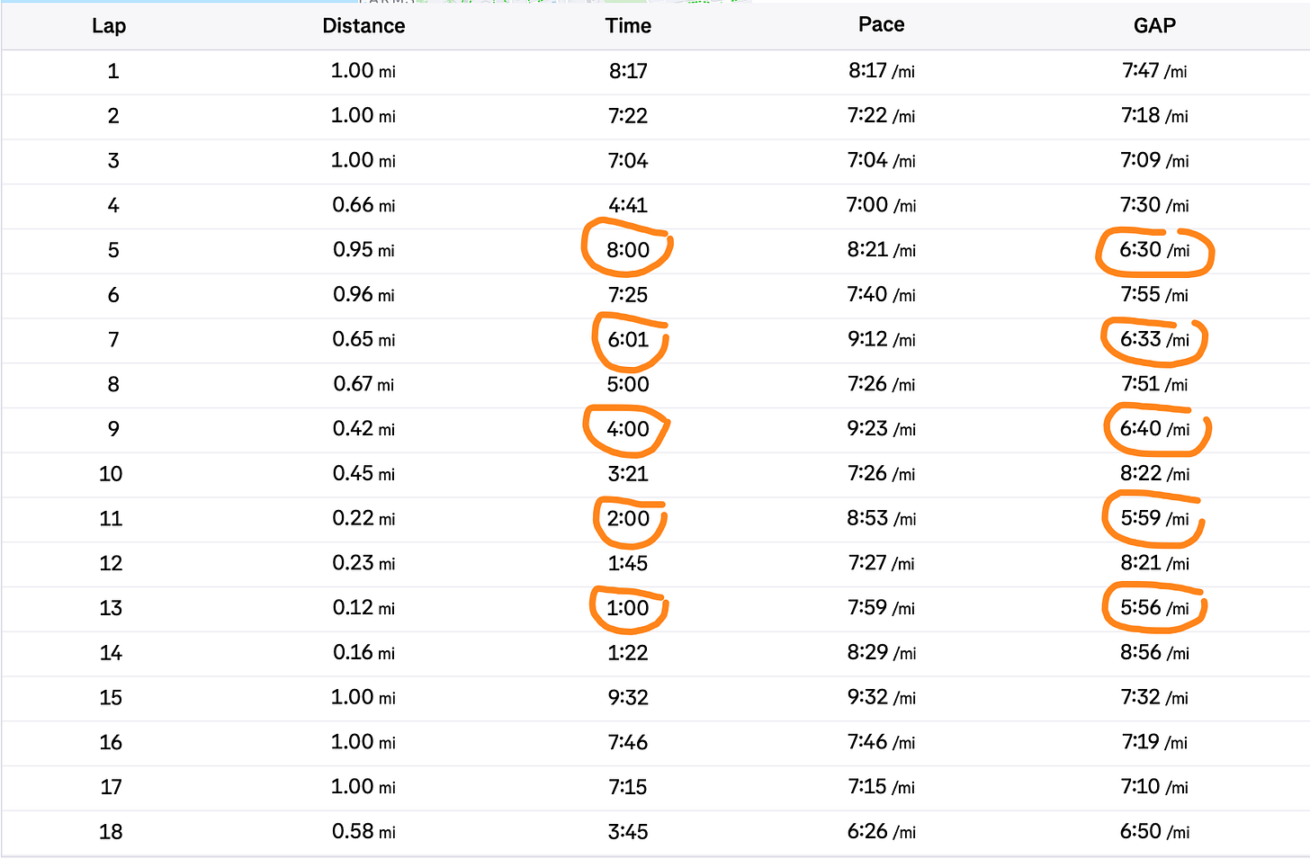 Now, eight years later and tens of thousands of miles between, I’m running each of my uphill efforts more than a minute per mile faster: my 10 minute effort is run at 5:32-5:37 mile GAP, my 8 minute effort at 5:25-5:32 mile GAP, and so on.