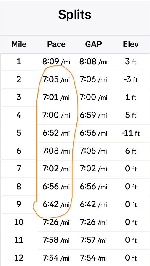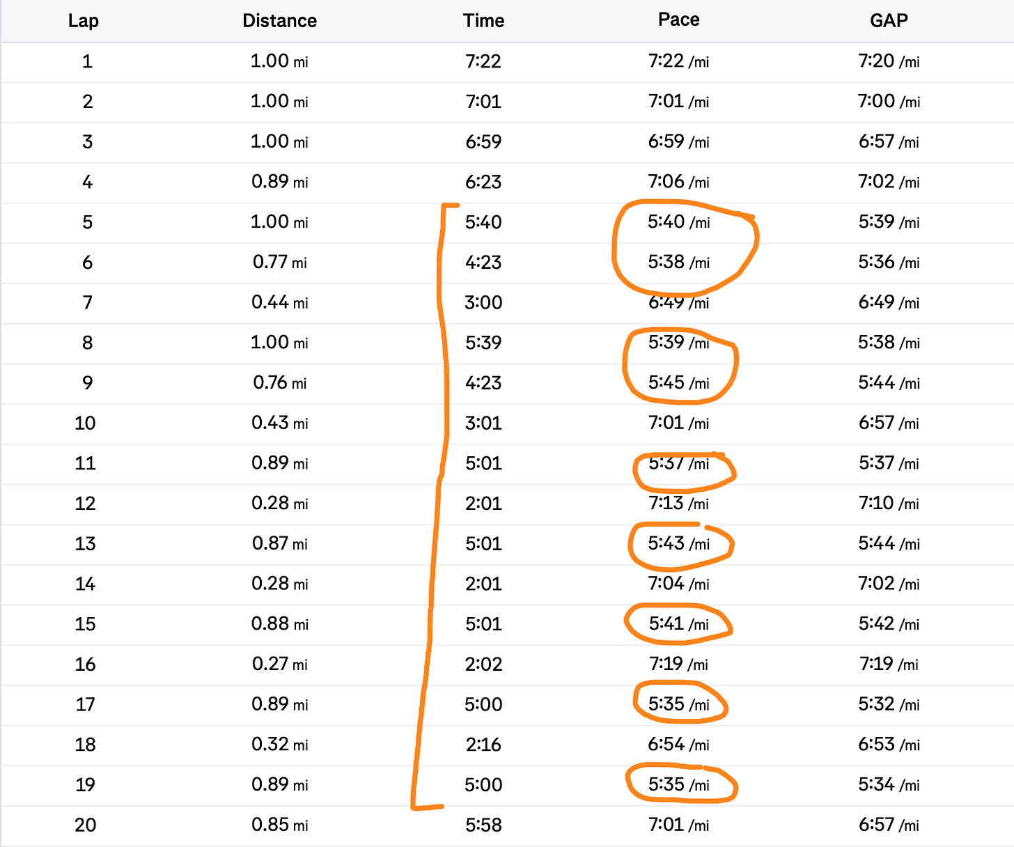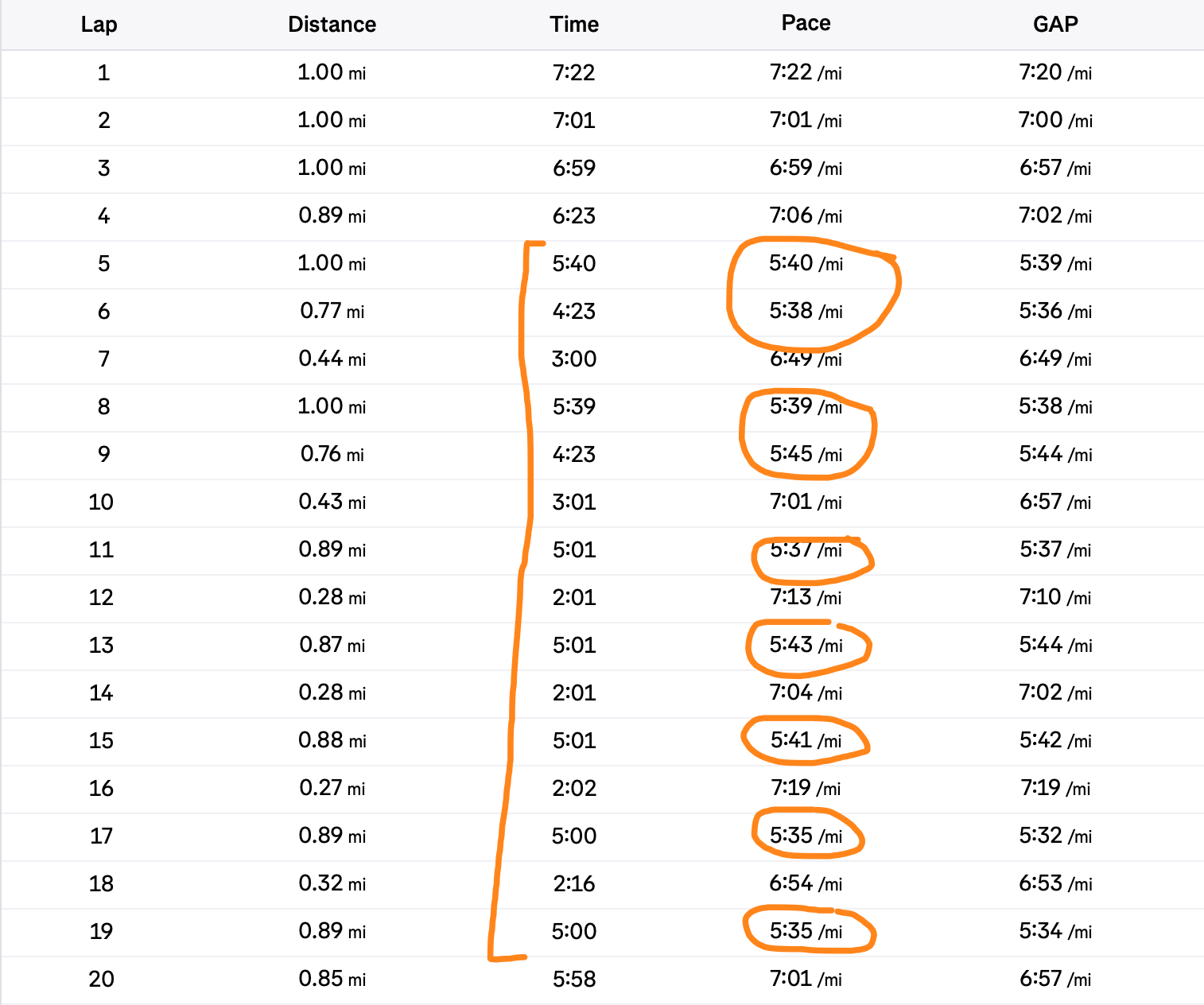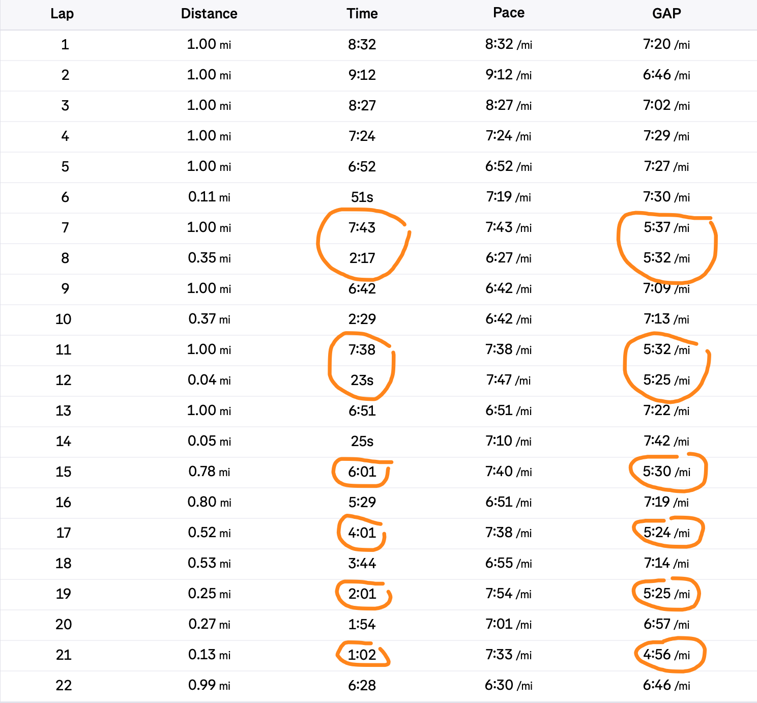 Now, eight years later and tens of thousands of miles between, I’m running each of my uphill efforts more than a minute per mile faster: my 10 minute effort is run at 5:32-5:37 mile GAP, my 8 minute effort at 5:25-5:32 mile GAP, and so on.