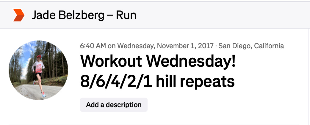 I ran this 8/6/4/2/1 minute hill workout on November 1, 2017 in San Diego, California: